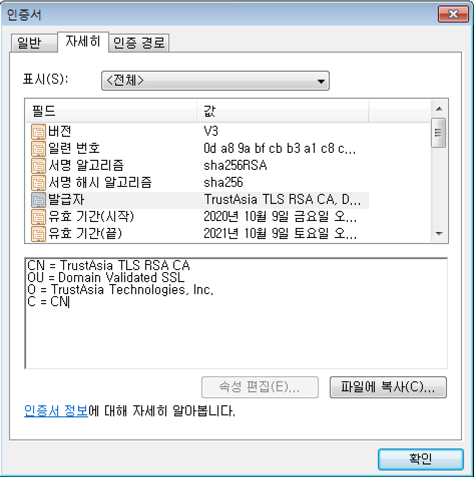 HTTP 연결 혹은 주로 Let's Encrypt의 SSL인증서를 사용하던 기존 피싱 사이트와는 달리 이 피싱 사이트에서는 중국의 TrustAsia Technologies, Inc. 에서 발급한 SSL인증서를 사용하고 있습니다.