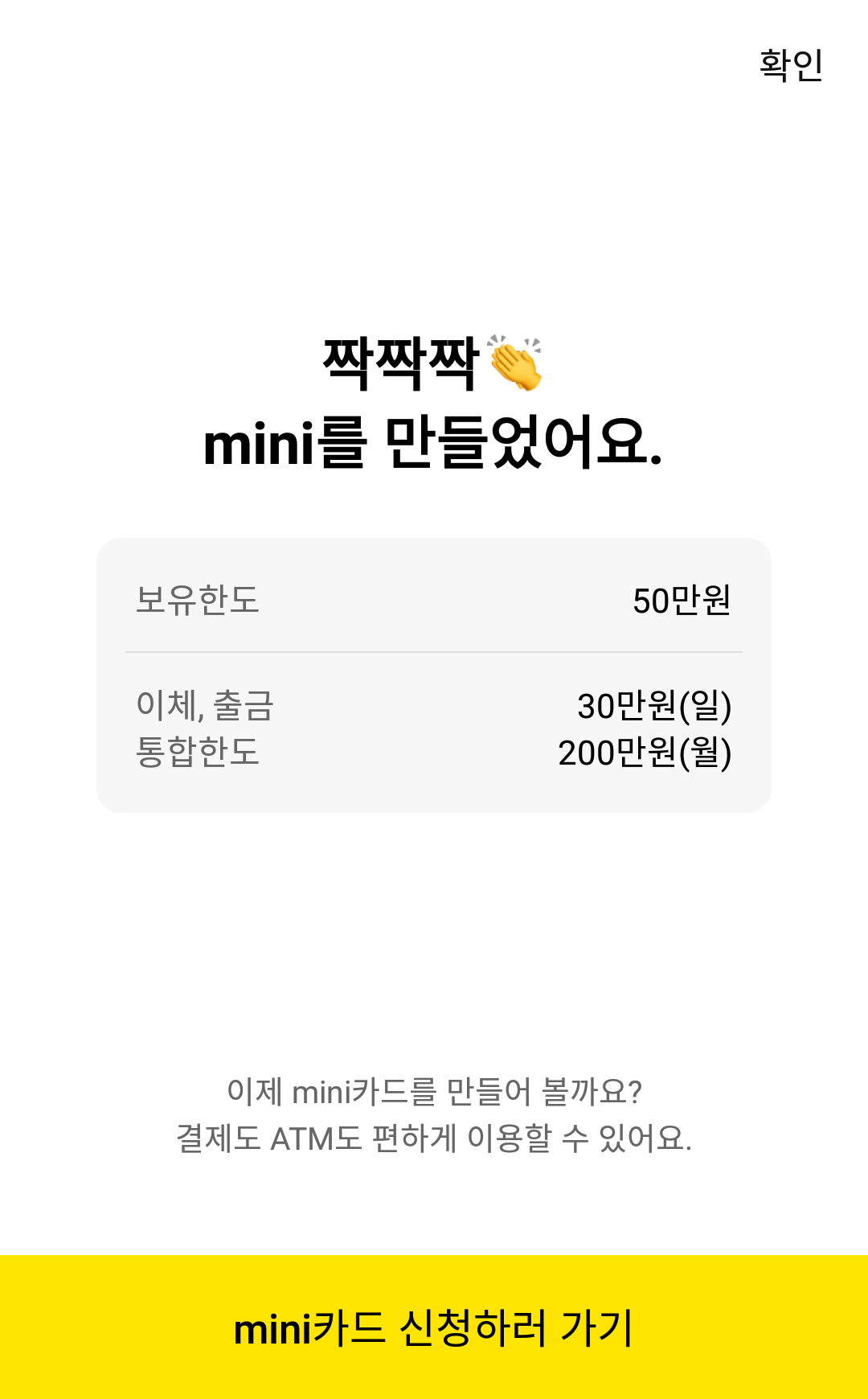 이제 카카오뱅크mini 발급이 완료되었습니다~!